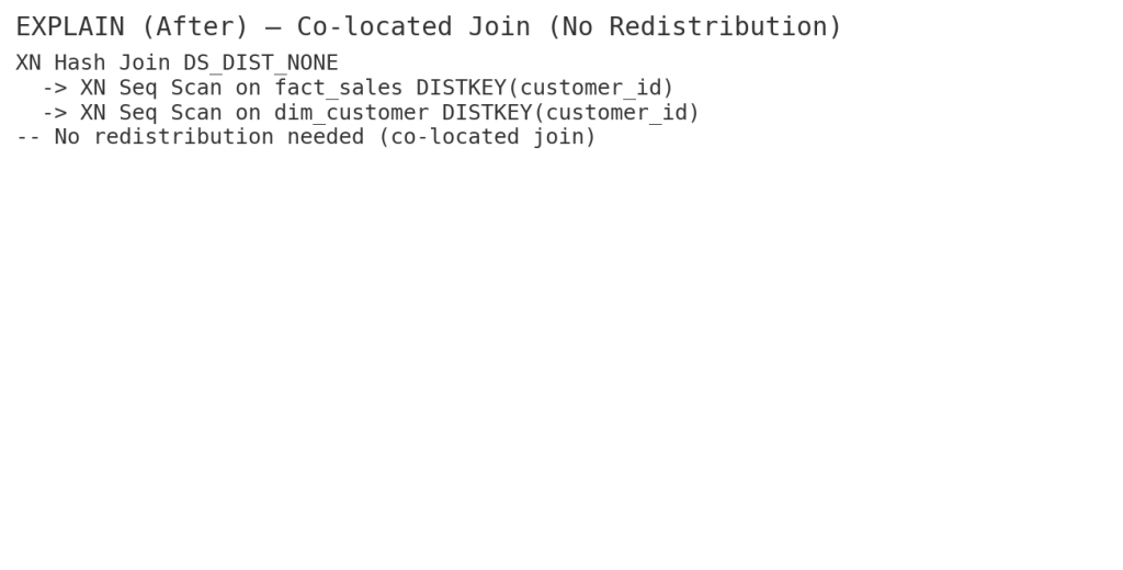 If most queries join on customer_id, using it as the DISTKEY ensures co-located joins, eliminating expensive data redistributions, even if it creates mild skew.